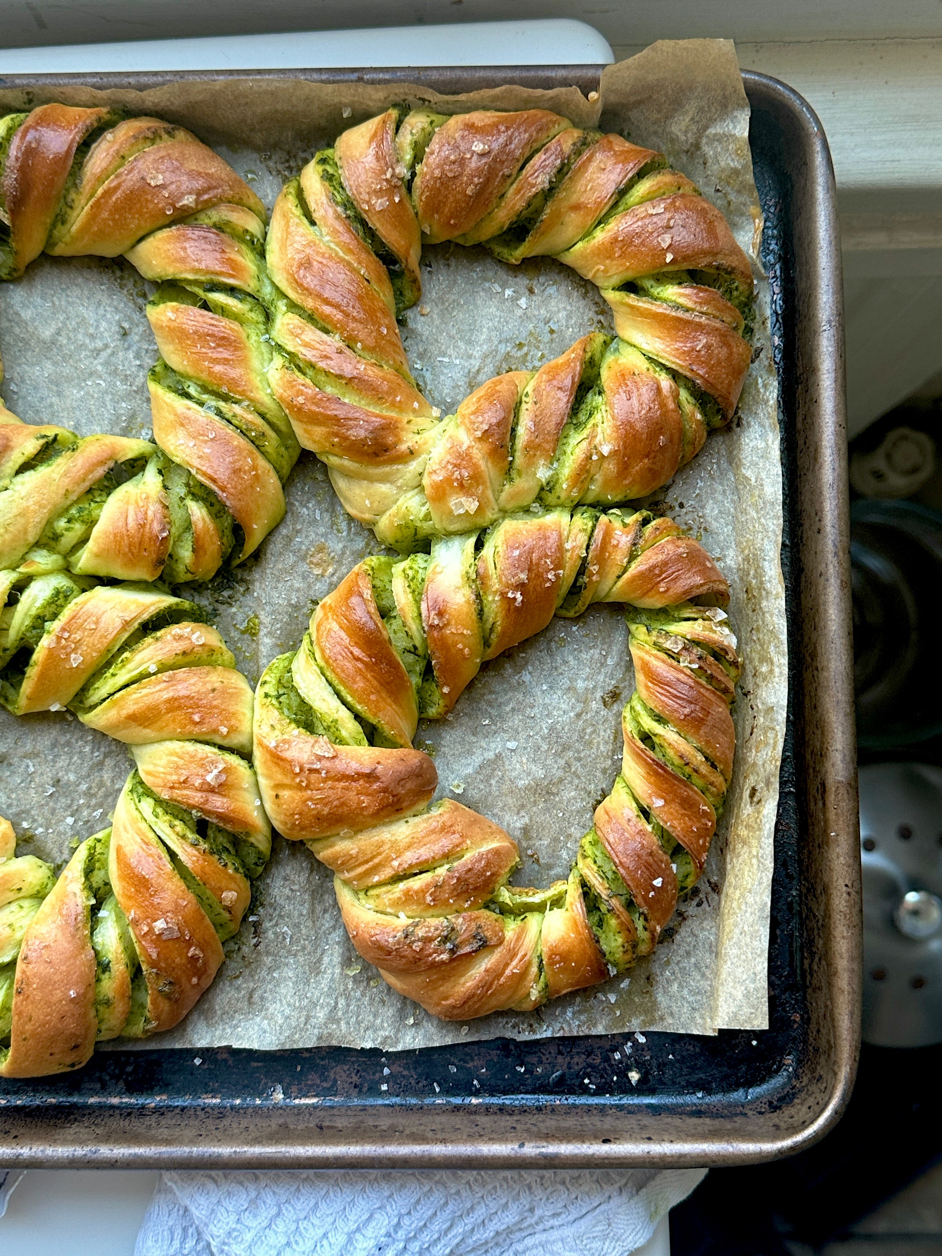 Whilst you are rambling around in the sunny spring weather, perhaps you’ll come across a patch of wild garlic leaves. If you do, I highly recommend processing the aromatic leaves into a bright green butter, then folding it through an airy dough. There is a vaguely pagan energy to these, which feels good in the aftermath of Spring Equinox. Click here to make them.
