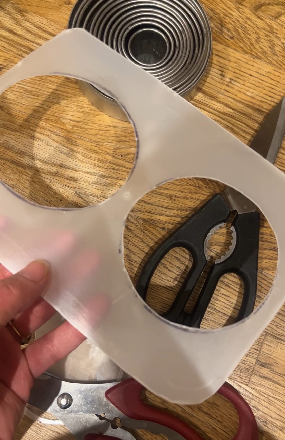 There are a few things that bring me straight back into the world of kitchens and bakeries. A glimpse of a giant cling film and blue roll transports me immediately, as does the sight of a tuile mould cut roughly out of a plastic lid. If you don't have plastic container lids available, you might need to go searching in your house (I've heard of ring binder folders giving their lives for tuiles) for something thin and plastic to cut the circles. I trace a circle around an 8cm or 9cm cutter, then stab the middle with a sharp knife, taking the rest out with scissors. If it's not perfectly neat, it's okay, it doesn't notice in the final shape. You do need a silpat mat for these - tuiles don't bake well on baking paper I'm afraid, and can be quite tricky to remove. According to Food52, you can use greased foil. But I've never tried it.