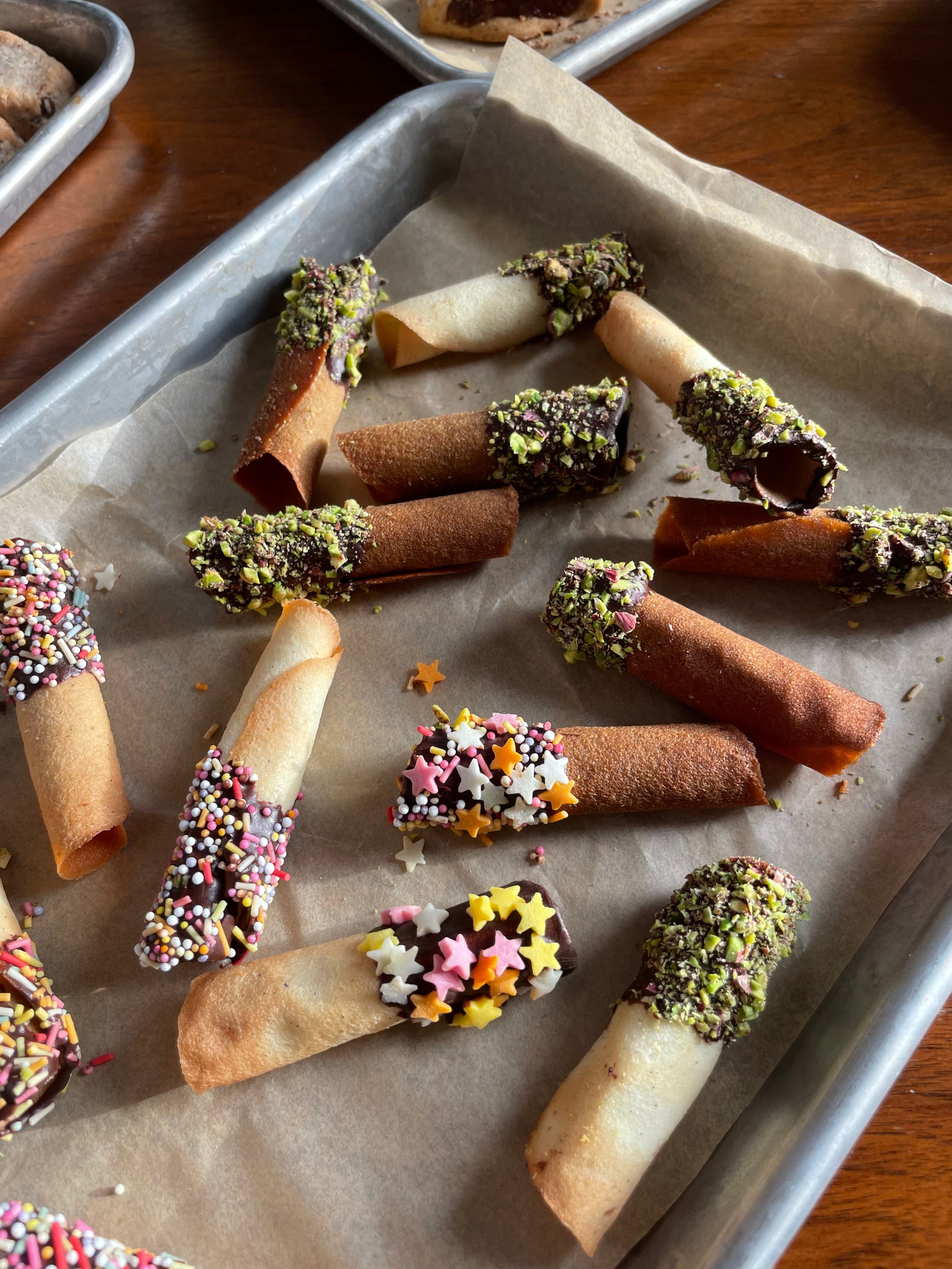 Allow the rolled tuiles to cool completely on a wire rack. They will crisp up as they cool. If desired, dip in chocolate and decorate with chopped nuts or sprinkles.