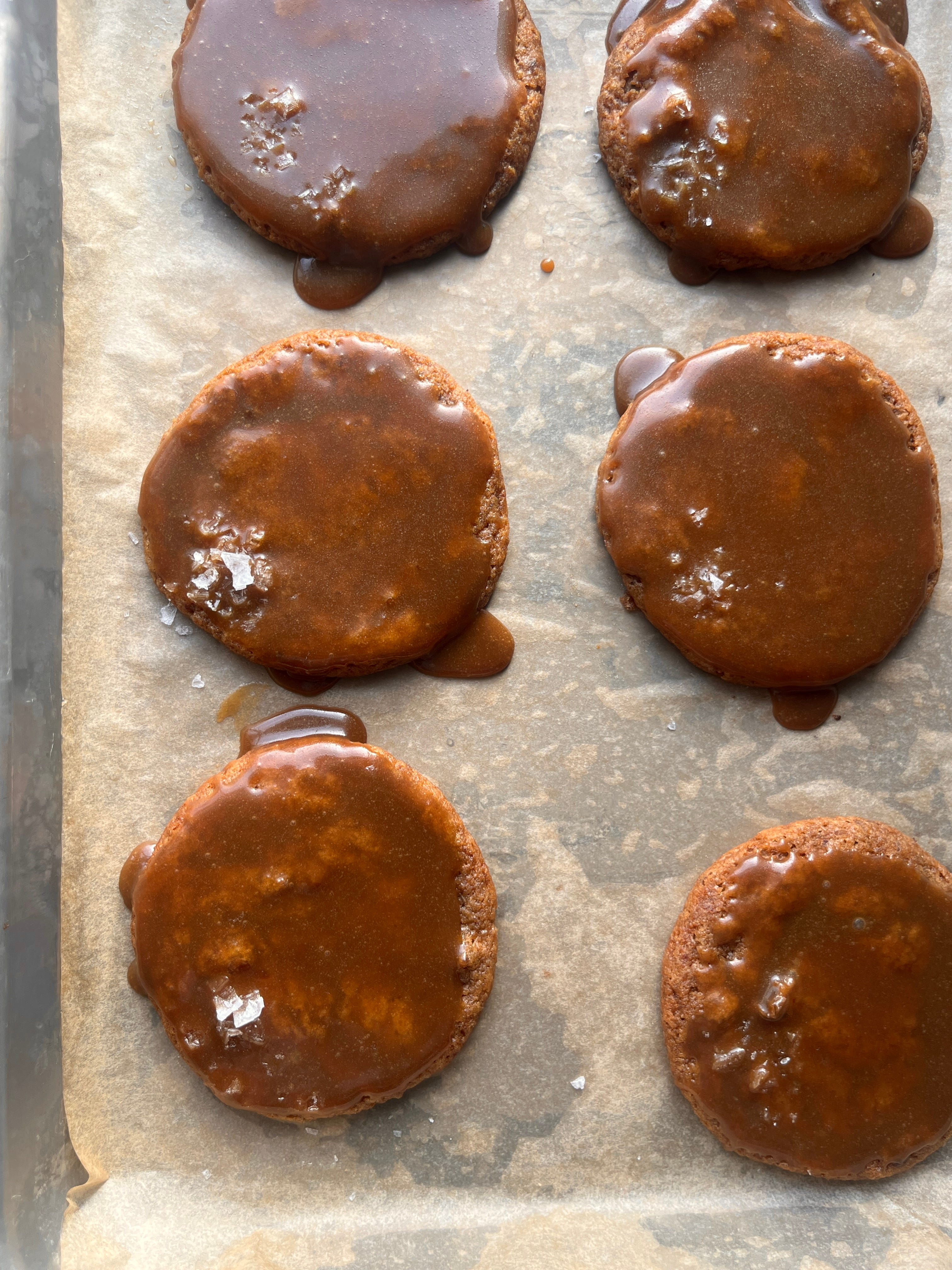 When the glaze has cooled off a bit, is thick but pourable, spoon it onto the cooled cookies, helping spread it to the edges with a spoon. Leave to set for a few minutes, sprinkle with a little salt.