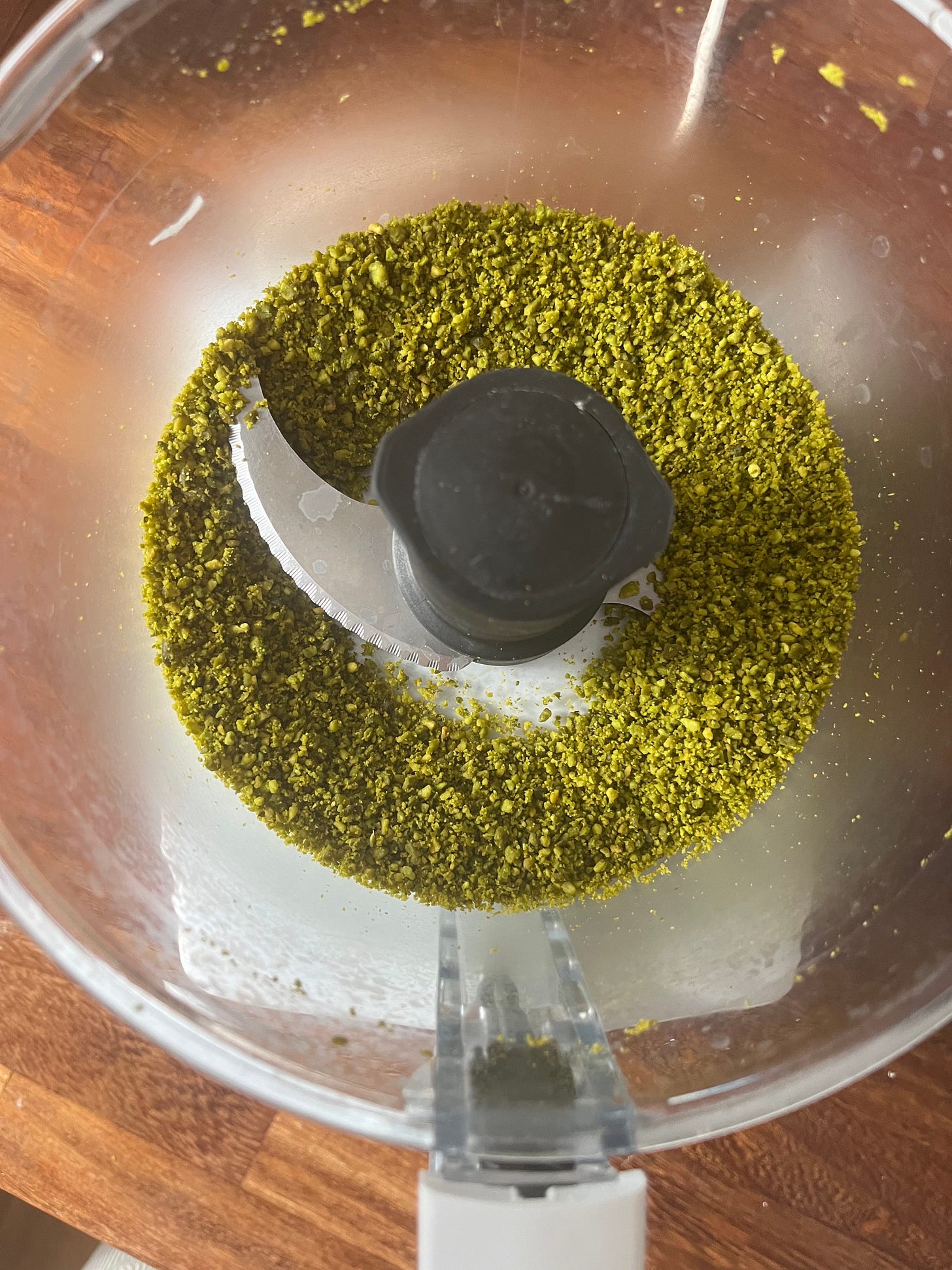 Grind your pistachio nuts - you want them to be fairly fine but its okay if there are still chunky bits!