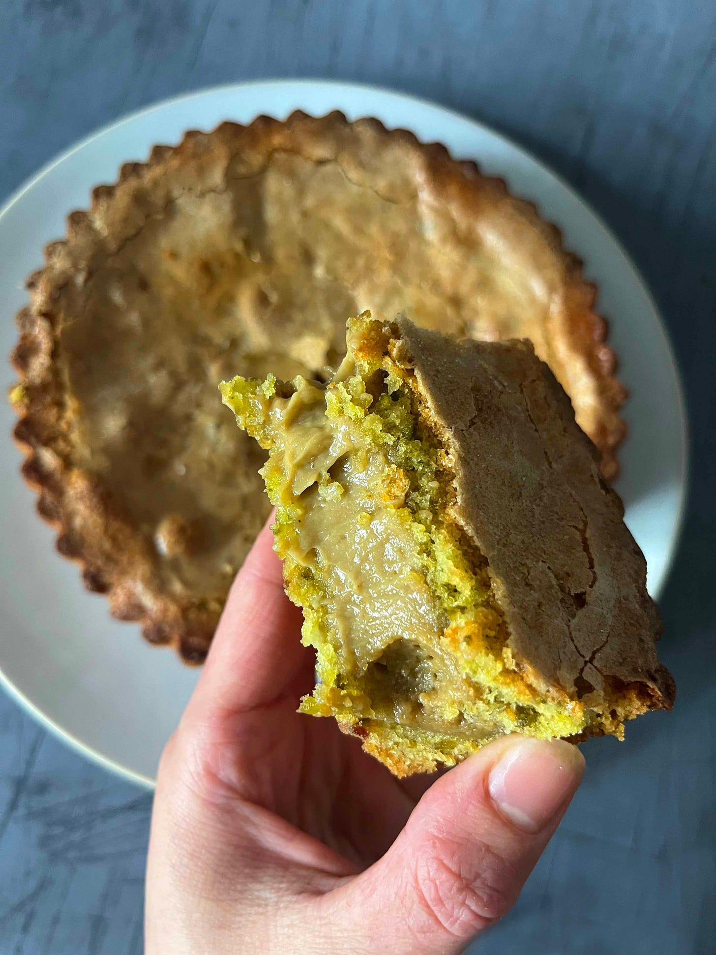 By using egg whites we are achieving an extra tender set thanks to the extra moisture that is in the crust. As well as this, egg whites are total team players because they are pretty flavourless. Egg yolks are SUCH scene stealers and the egg white allows the flavour of the pistachios and butter to sing. Thank you egg whites.