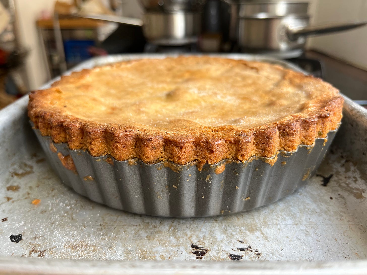 If you can see air has got trapped between the custard and the dough, stab vents into the tart then press gently to release the air, then close it back up!