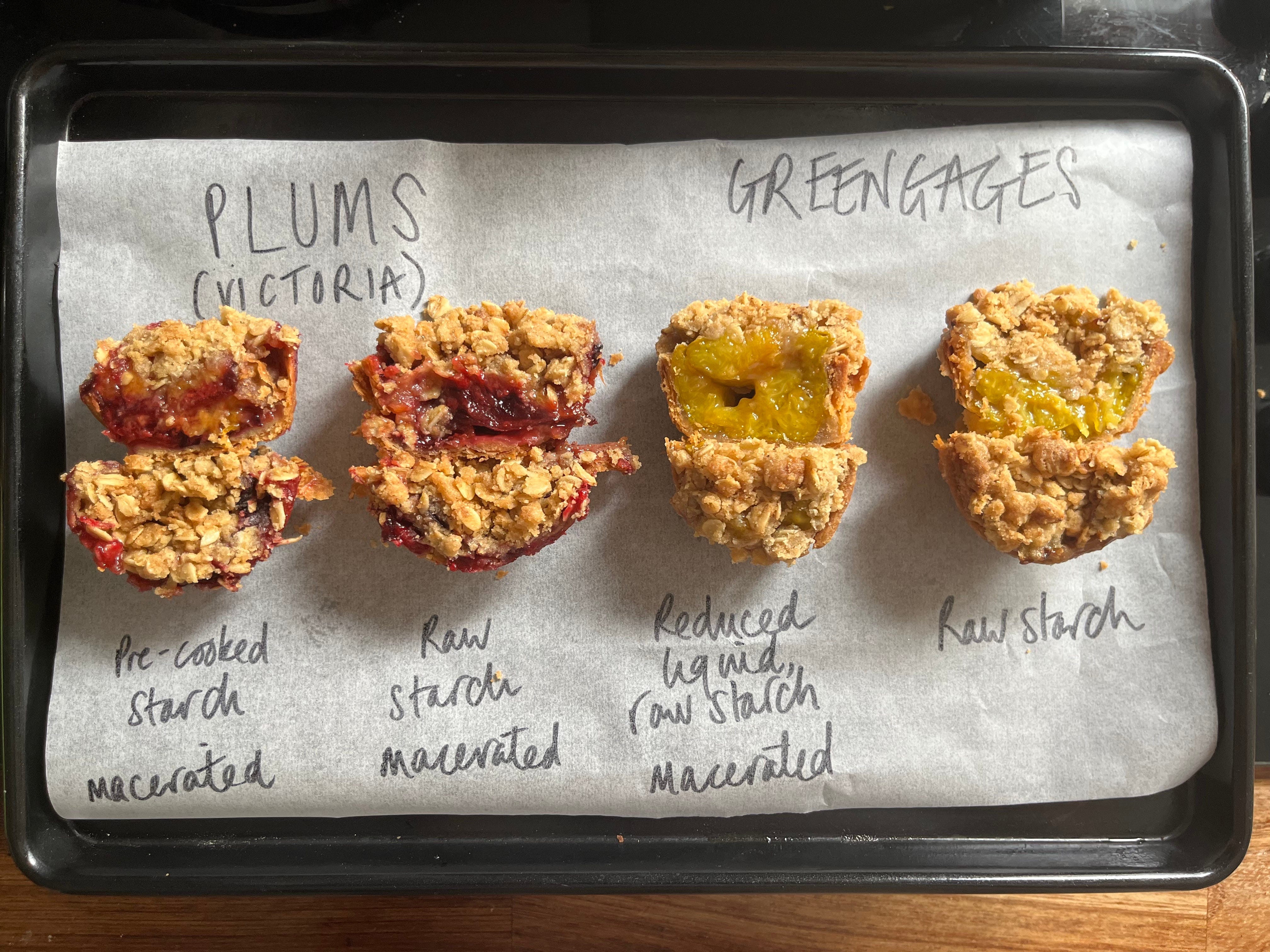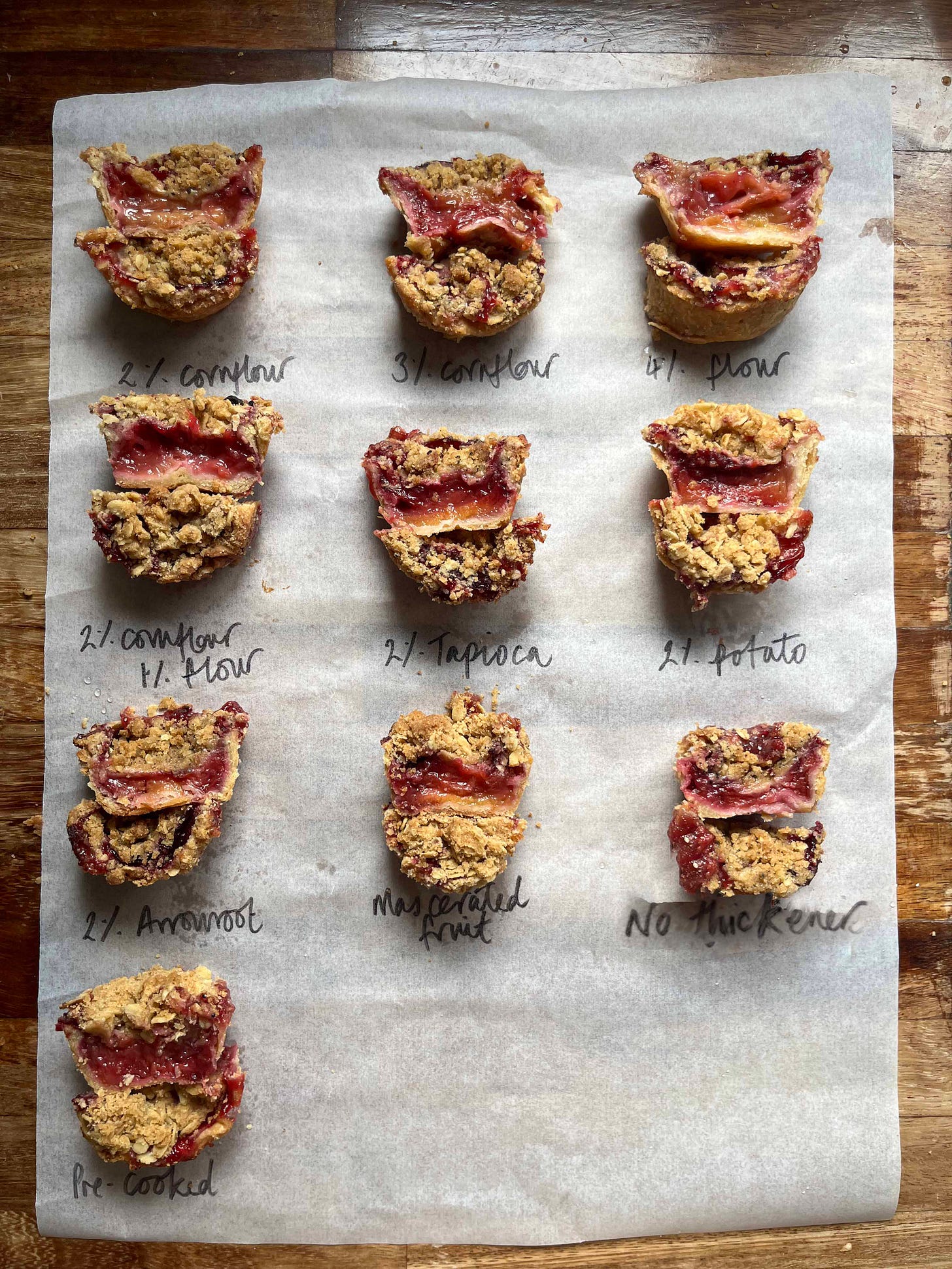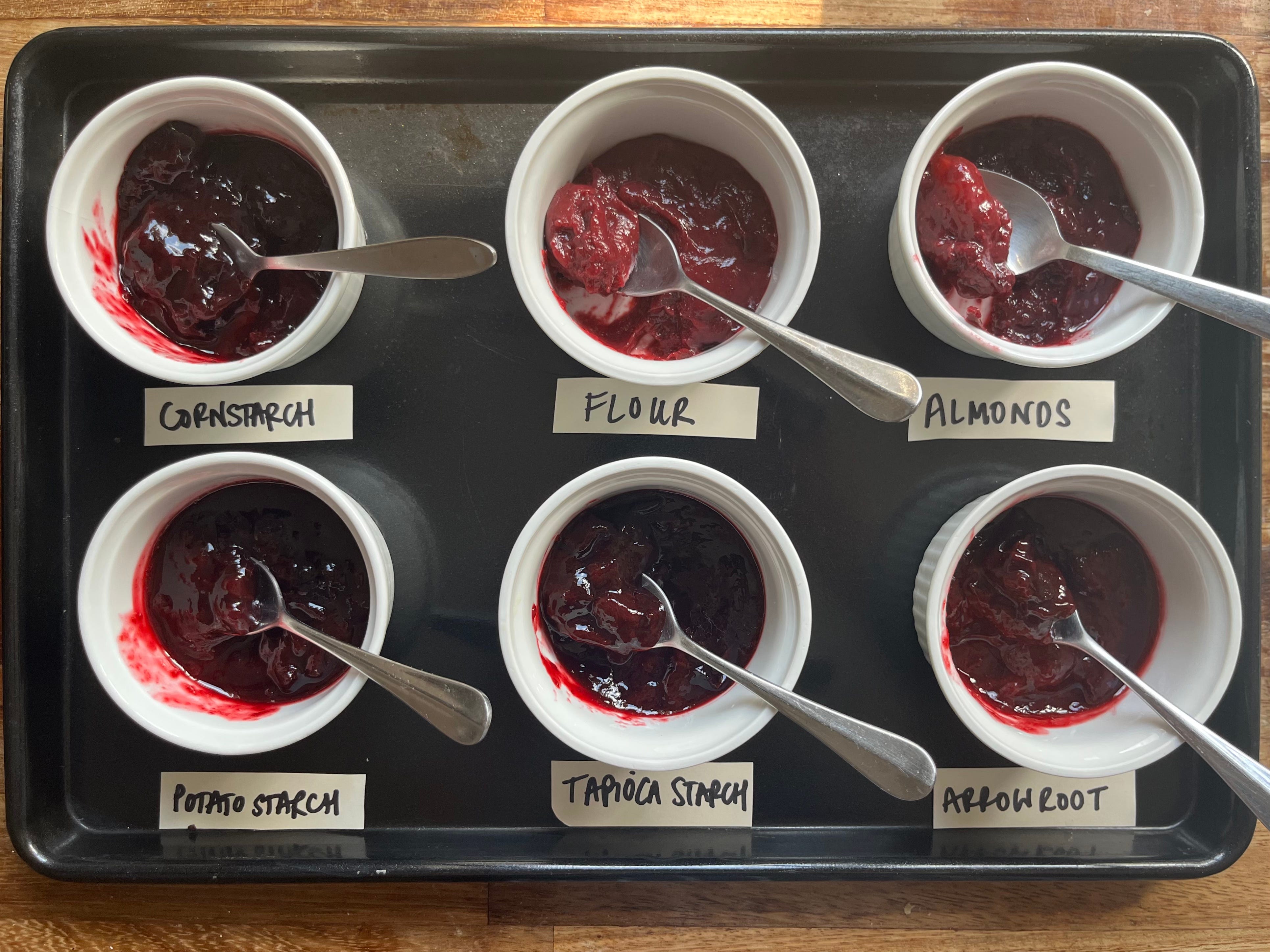 So, what are our options? I tested the key players with plums: Wheat flour, Cornstarch, Tapioca, Potato and Arrowroot. Oh, and ground almond - which isn’t a starch at all - just to see how it compares. I tested both the stove cooking method (see below) and cooking in the oven (above).