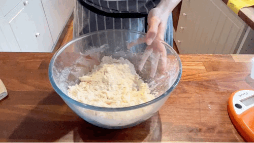 Add the egg/milk in three parts, using a fork to toss it each time. Bring it together in a ball. It will be pretty moist. Wrap it and put it into the fridge for at least 1-2 hours but it can last wrapped for three days.