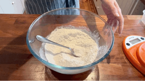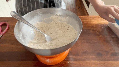 Scale oats, flour, salt and sugar into a bowl. Toss with the cooled but still liquid brown butter until clumps form. Set aside in the fridge until ready to use. If it’s really thick, then you may need to use a fork to form clumps once it is cooler and the butter has hardened.