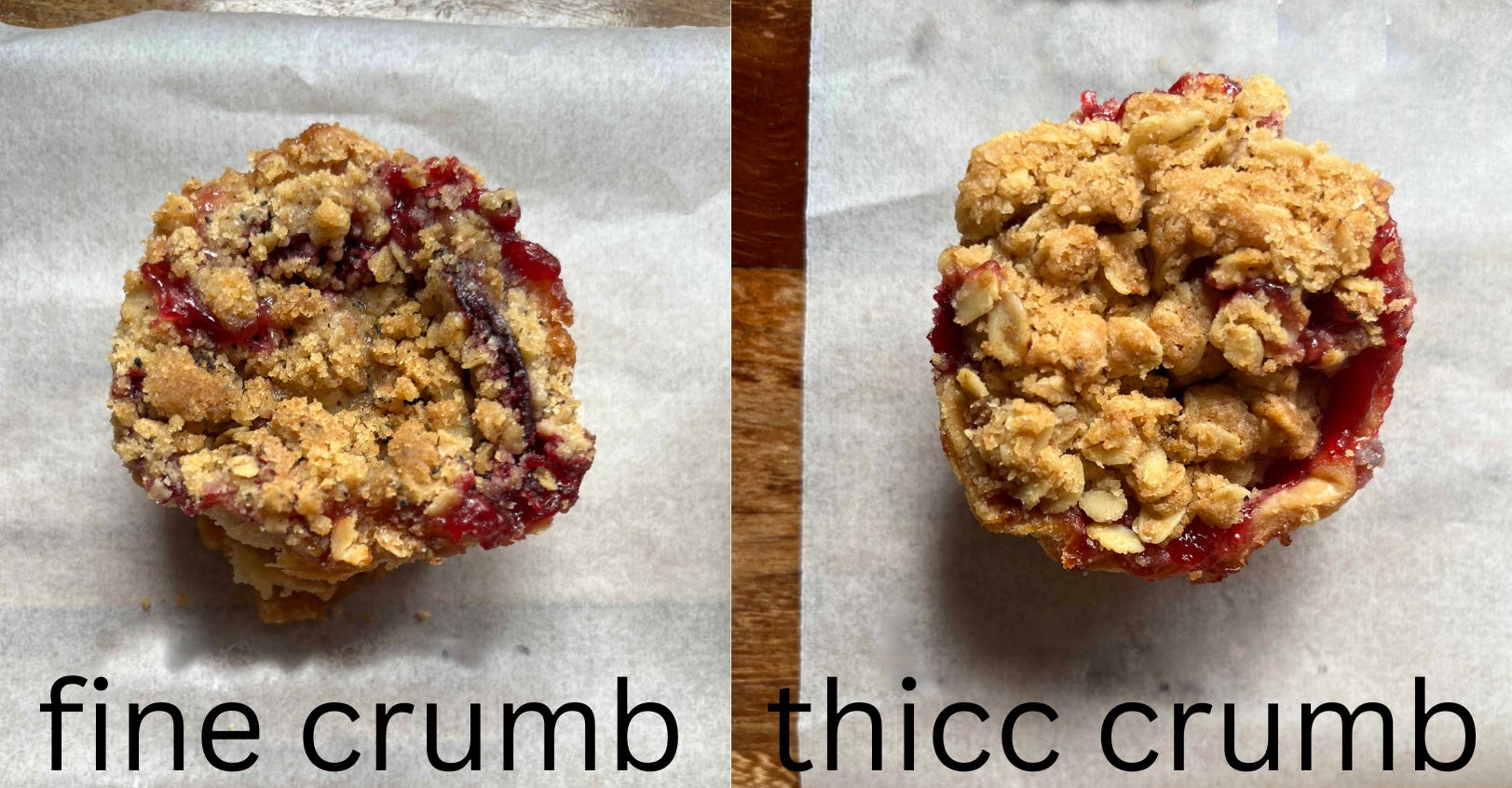 The FINAL hurdle is our crumb. I tested two options for today: A classic fine crumb and a clumpier version with more butter. In a decision that will surprise no one, the thiccccc crumb came out on top, even though it is a bit harder to cut! Though you don’t have to brown the butter, I think it adds a beautiful dimension to the whole affair. The crumb is also the perfect place to add spices or experiment with different flours - buckwheat would be great here.