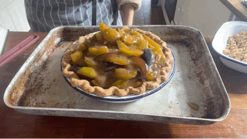Because we have par-baked our case, you can use the filling right away. Pour into your prepared pie case and cover with crumb (you may need to crumble it up a bit more as you go!)