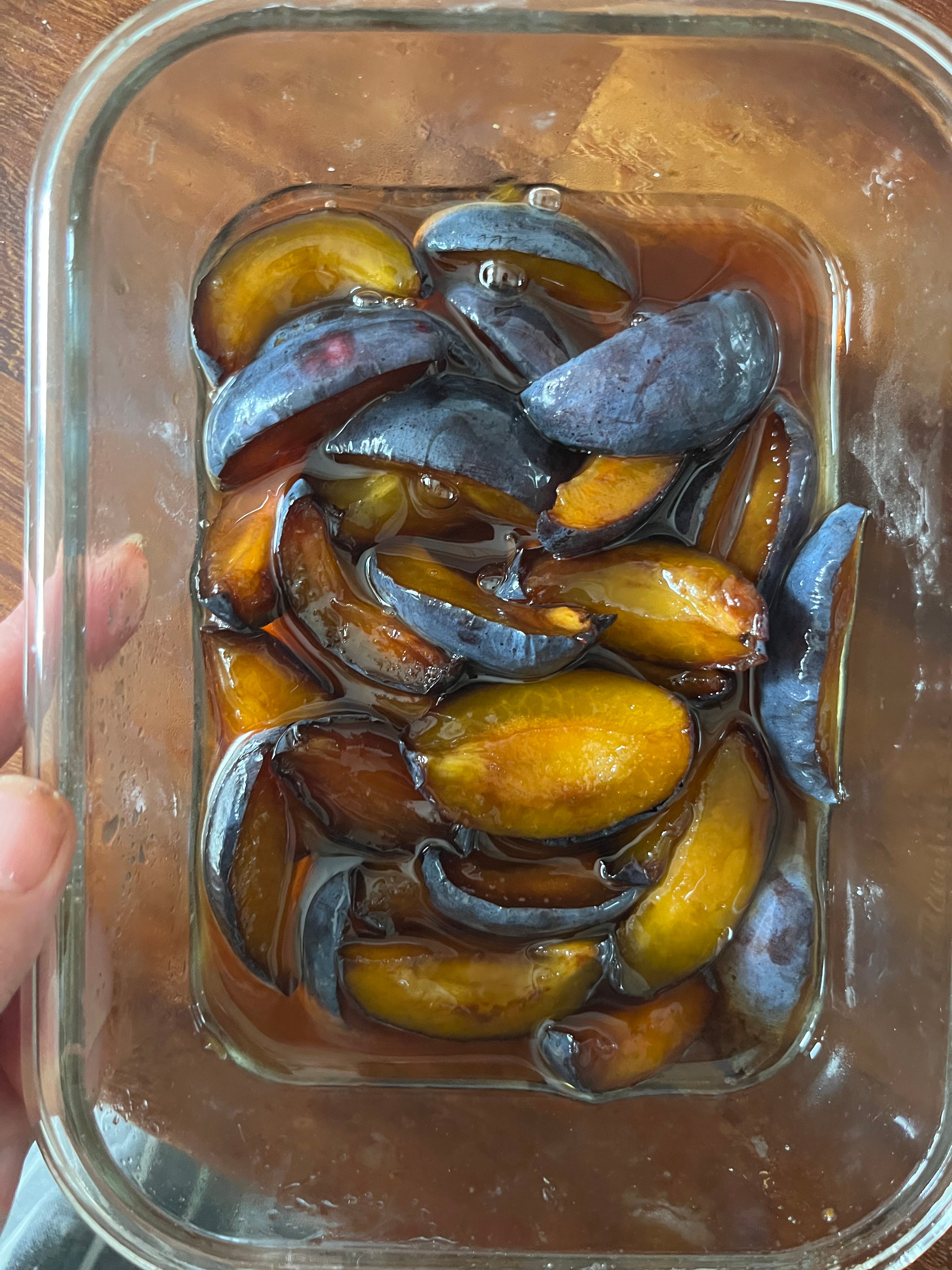 Destone plums and cut any hard bits off the inside. Cut into quarters and move into a container you can keep in the fridge. Toss with the sugar. Leave for at least 30 mins - 1 hour but up to 3 days, occasionally stirring to make sure the sugar is dissolved.