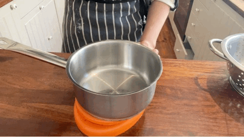 Heat syrup, simmering until you have around 80-100ml left. You do need to boil here, but since it’s so concentrated with sugar, watch out it doesn’t burn! Pour into the measuring jug to check the reduction volume and leave to cool slightly. Sift the starches together and add 1.5 tbsp of water to make a smooth slurry. Mix slurry into your reduced syrup, then mix into your fruit and mix.