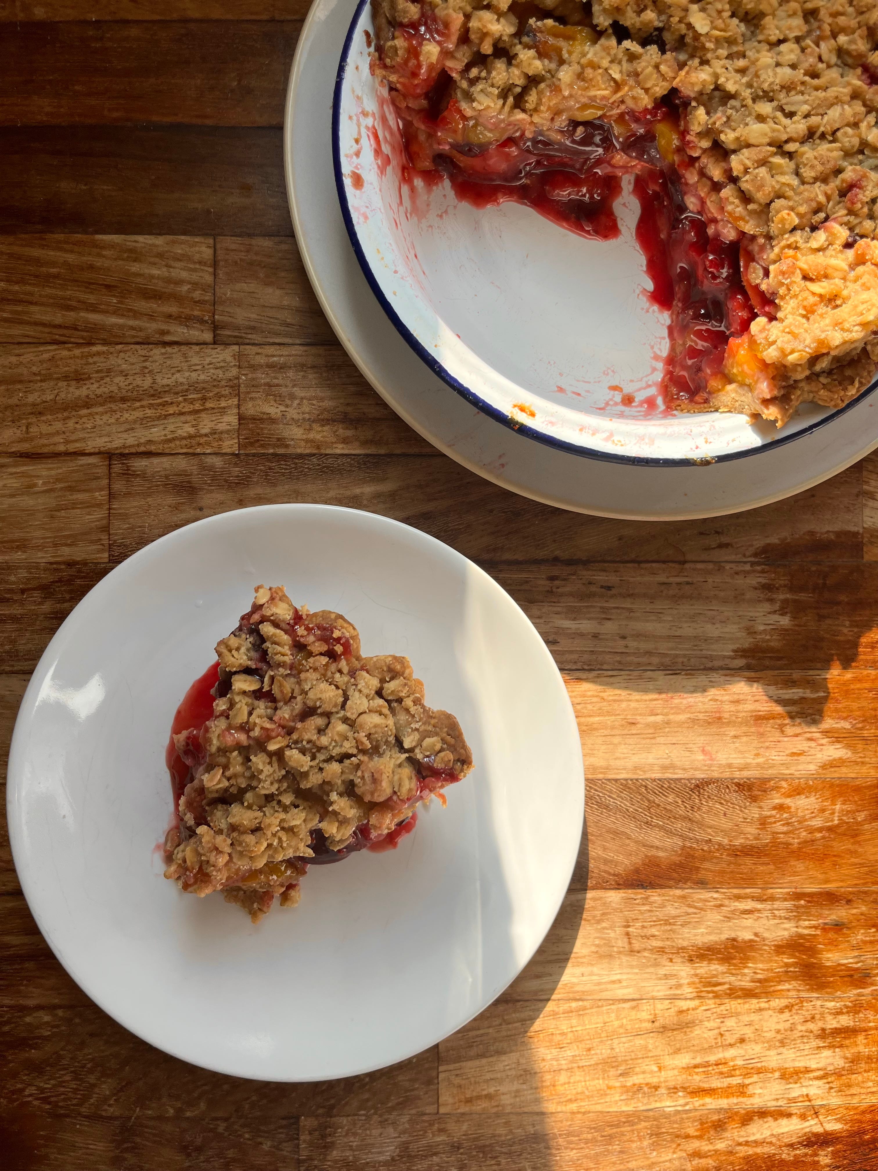 Bake at 180c for 40 minutes, or until the filling is bubbling and the crumble is golden.