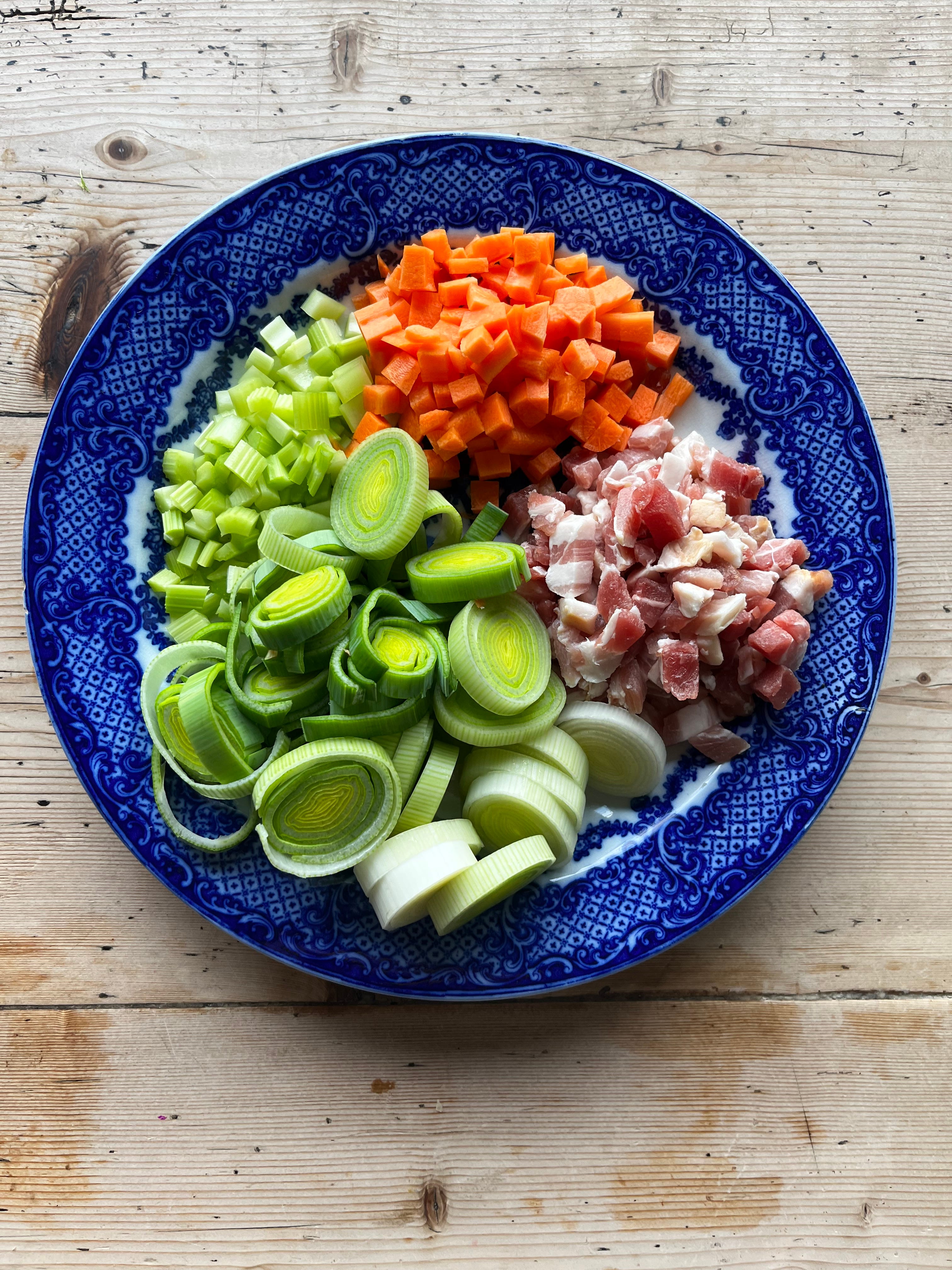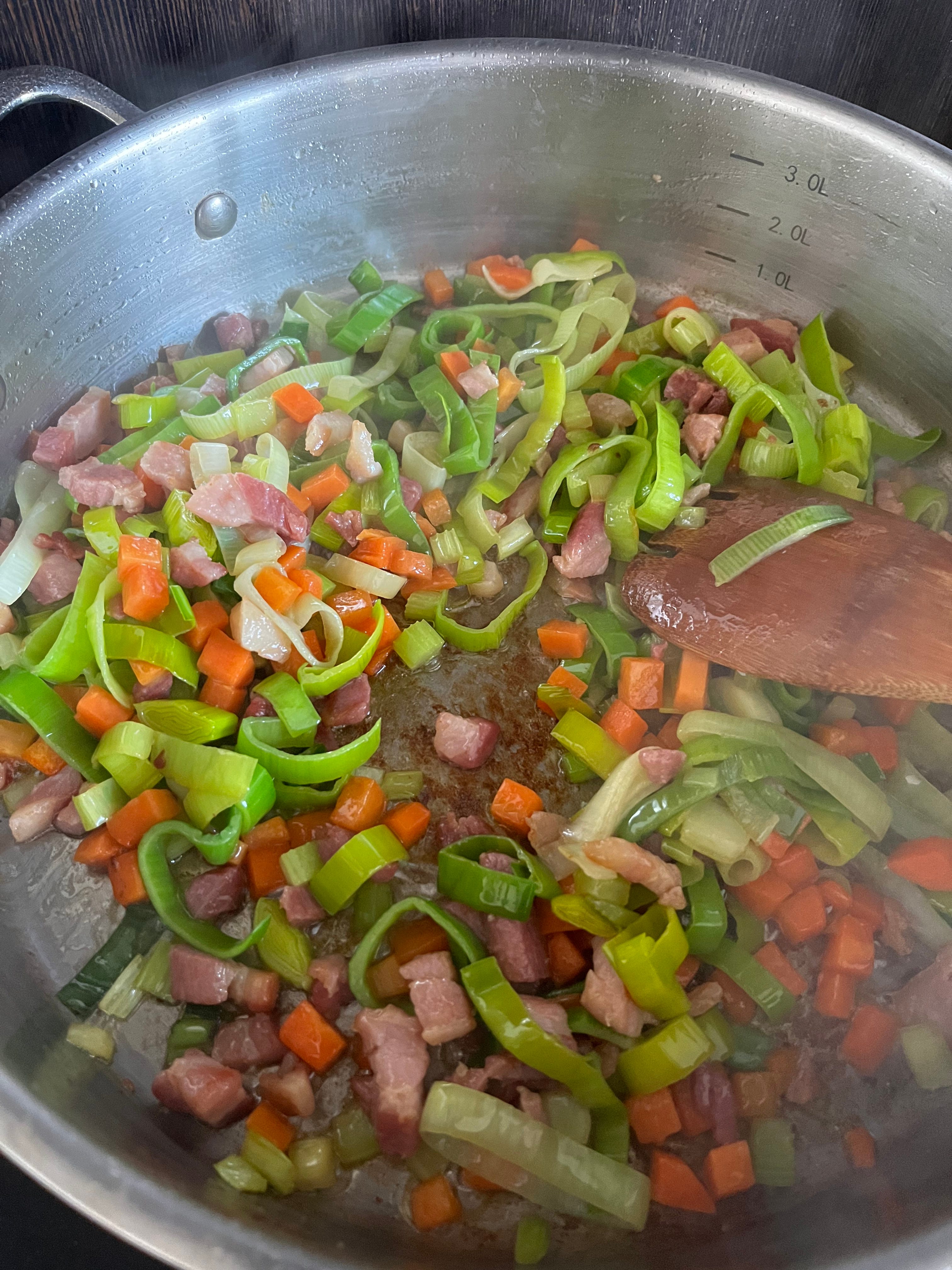 Add in the lardons and leave to render. They will release some of their own fat as they crisp. When the bacon is cooked and nicely golden but not super crispy, melt in the butter and then add in the vegetables. Season and then sweat the veg for 10 minutes until the leeks have wilted but haven’t taken on any colour