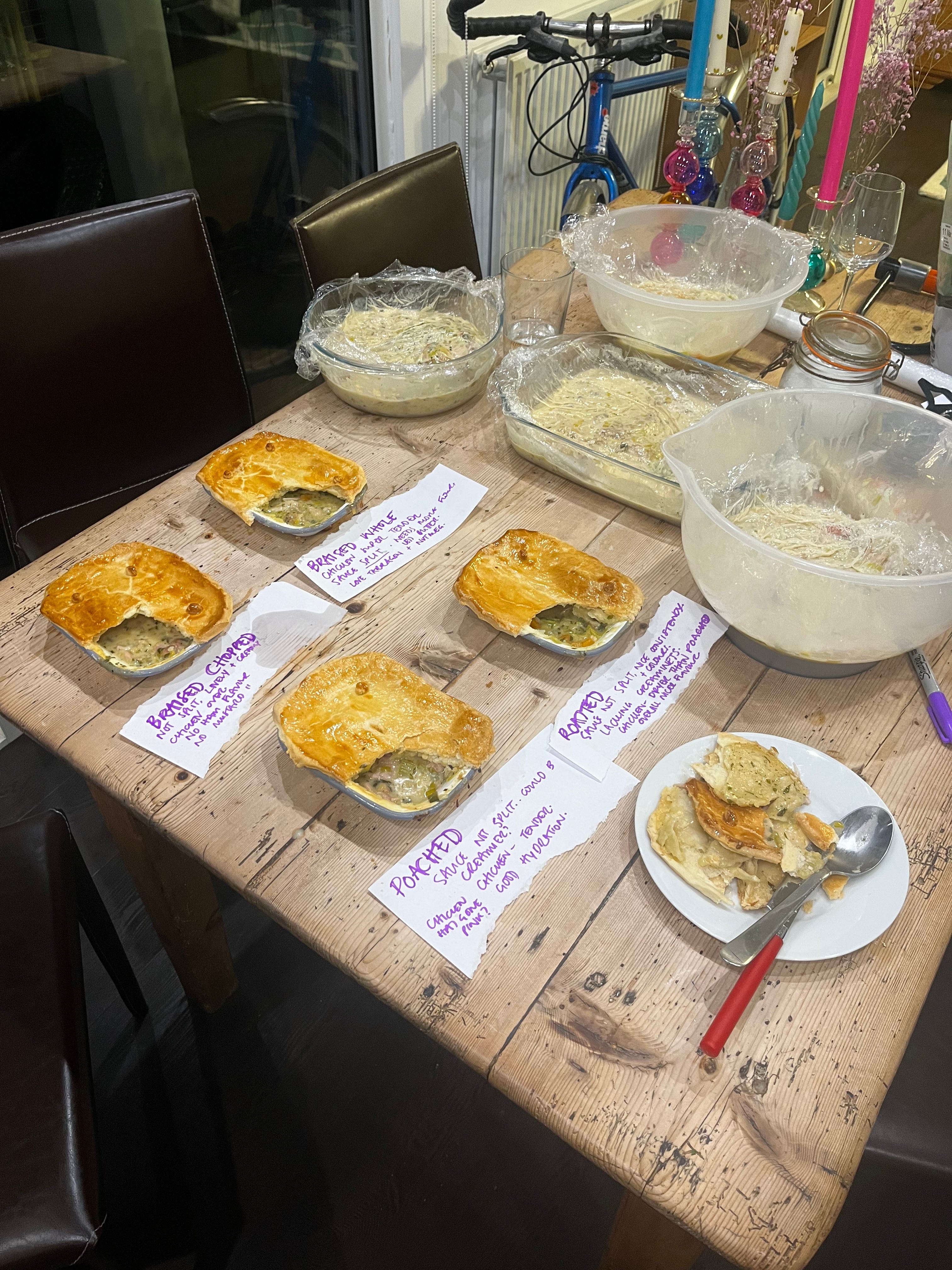 Rosie: Not always but 99% of the time I would say yeah, interestingly things like Cornish pasties and pies with mince fillings often all go in raw. But in the case of home pie making I do think it’s better for it to be cooked. For this week’s chicken pie, the two variables I’m going to investigate is 1) how the meat is cooked (roast/already cooked/poached/braised) and how to get the best out of it. 2) the flour quantity in the sauce - how do we create a luscious gravy that is silky smooth, not too thick…How do we get there!