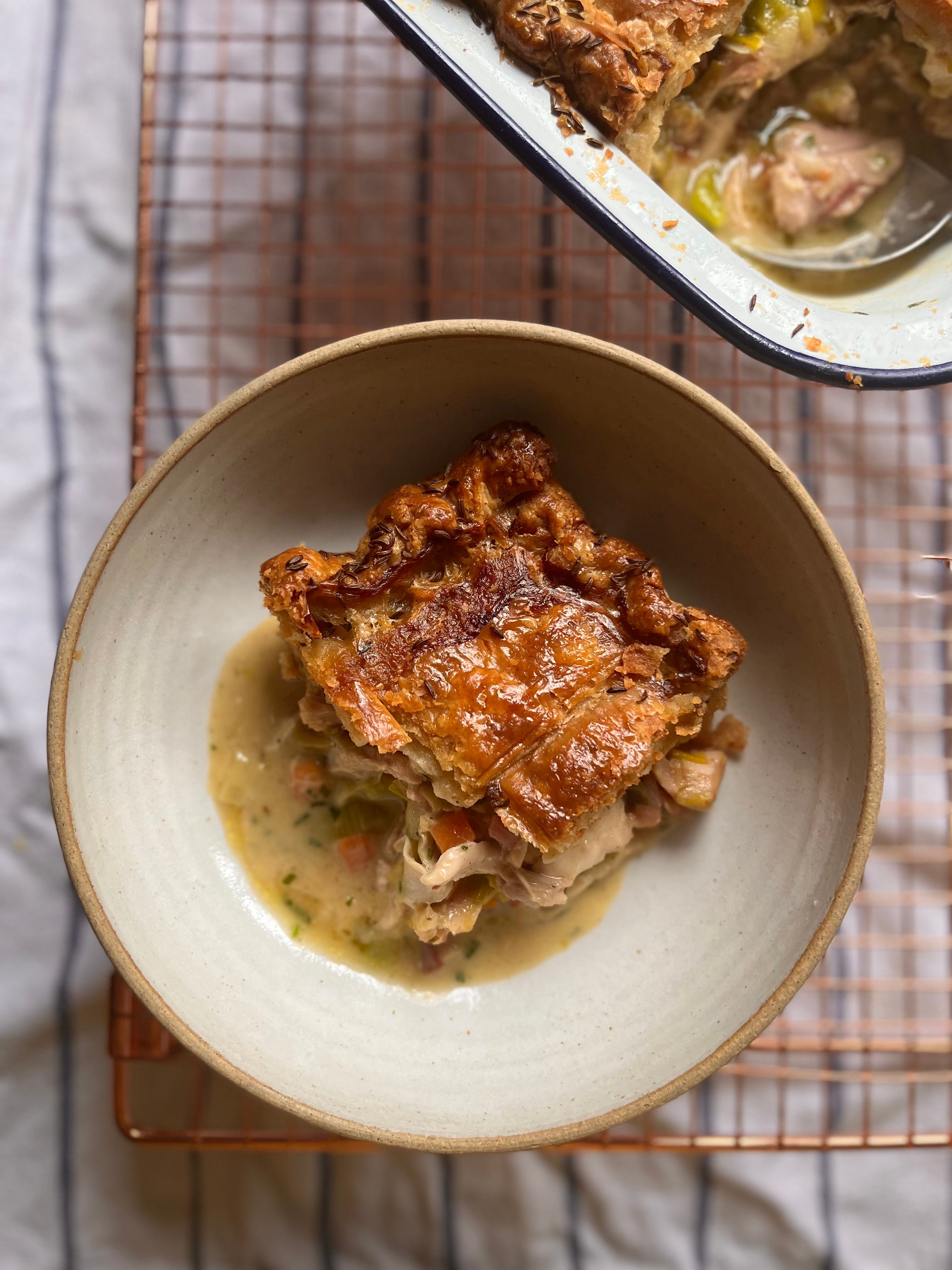 I absolutely love making pies. I love eating them too, of course, but there’s something about the methodical, ritualistic processes they involve that I find really soothing. Chicken pie is something a lot of people in the UK grew up eating, sometimes with added ham or bacon, otherwise mushrooms or leeks. Always rich, always comforting.