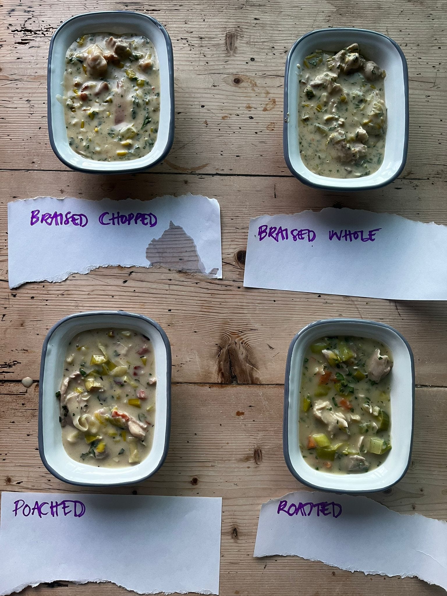 Braising is when you brown your meat, then veg, then deglaze the pan with an acid, typically alcohol, add any other aromatics, before finally adding stock. You add less stock than for poaching as the liquid will eventually become your sauce and your meat will usually not be totally submerged. The advantage of braising is that you preserve tenderness by cooking in a liquid, but you also get the maillard rection benefits of browning. I also tested out roasting as I’m sure we’ve all eaten a delicious leftovers pie at least once in our lives! I knew pre-roasting would risk a tougher result after the second cook, but the payoff of schmaltz - that divine roasty toasty chicken fat - was just too tempting.